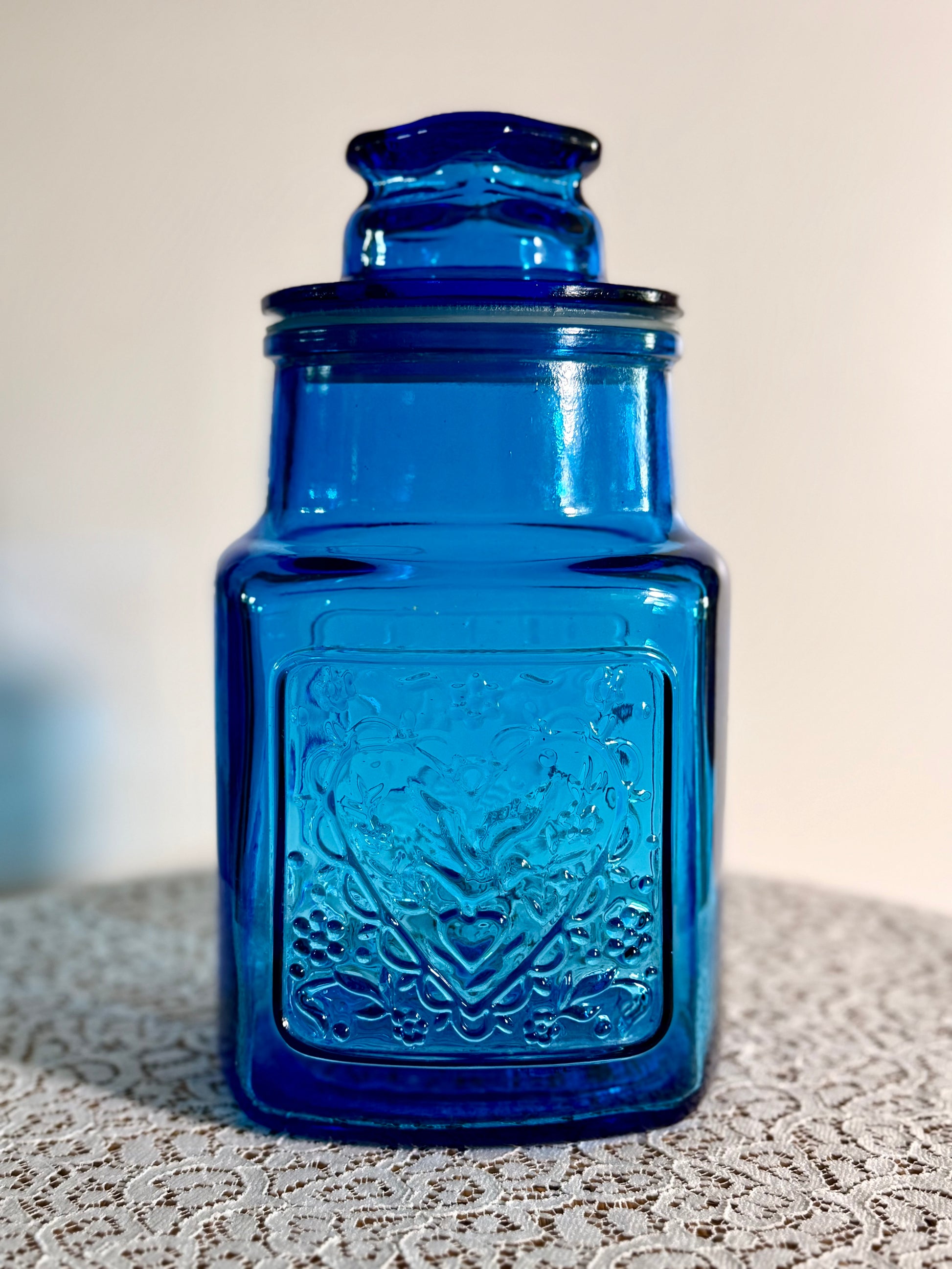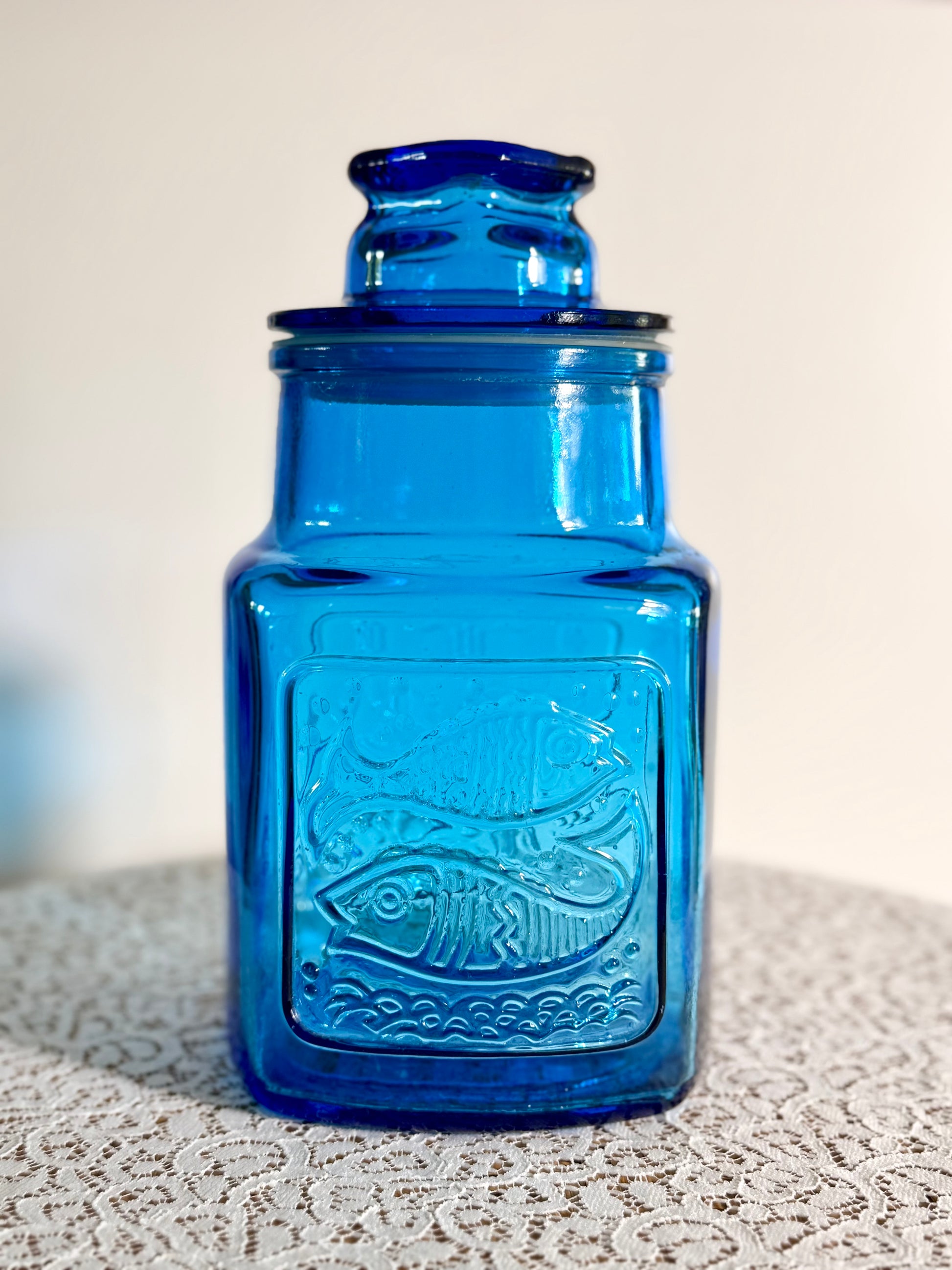 Pressed-glass jar in vibrant blue featuring embossed fish—a stylish storage piece.