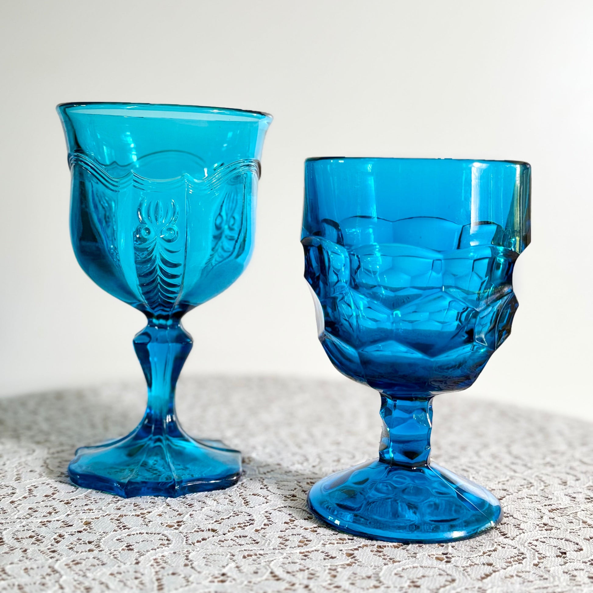 One goblet with honeycomb facets and the other with vertical ribbing—both in rich cobalt.