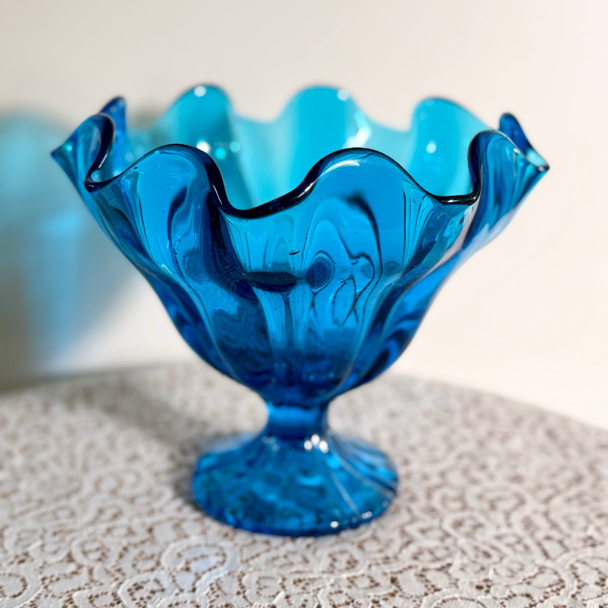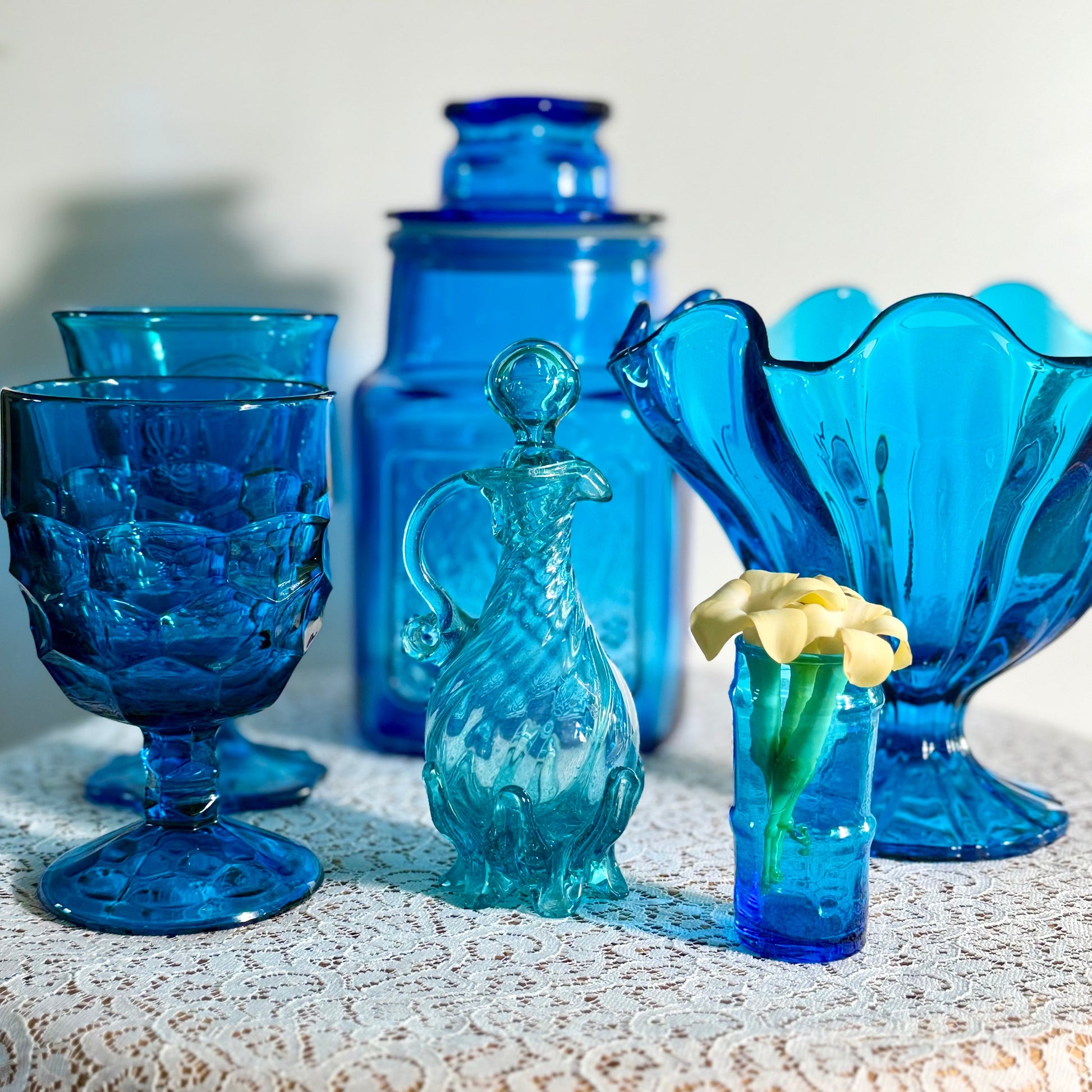 A radiant collection of azure-to-cobalt blue mid-century glass, thoughtfully curated to showcase hand-blown and pressed craftsmanship. Each piece reflects the vintage elegance and bold color palette of the Imperial Azure and Empoli traditions—ready to elevate any collector’s space.