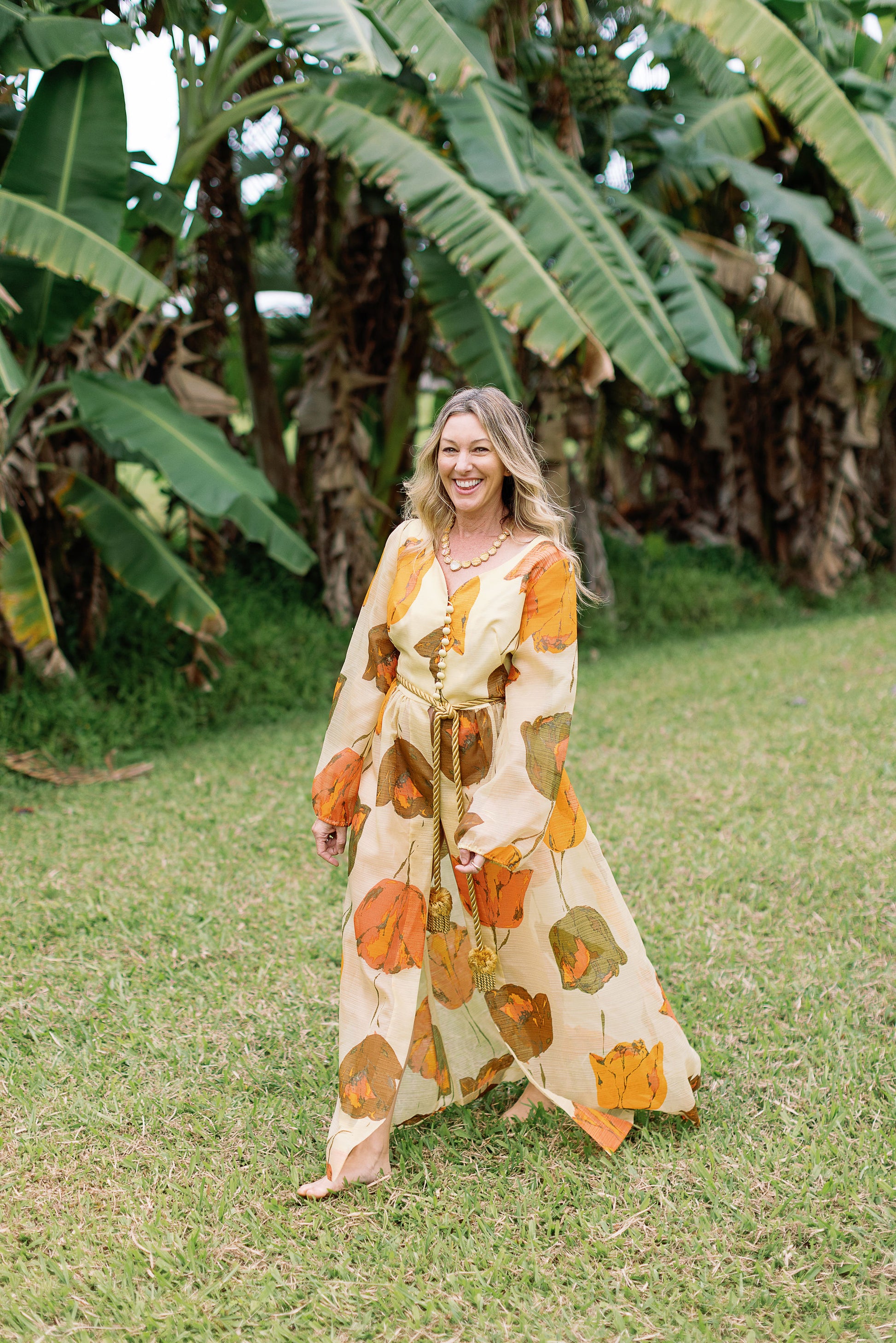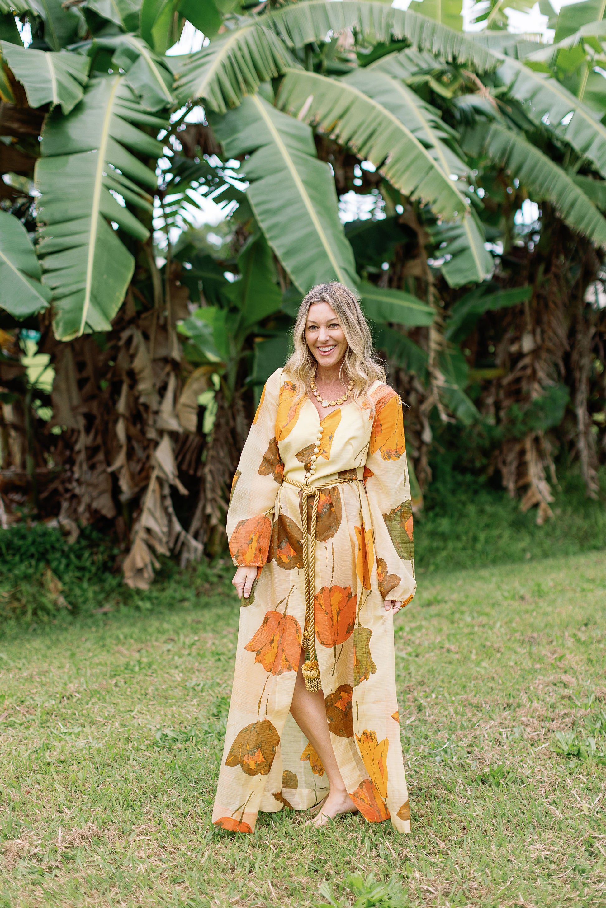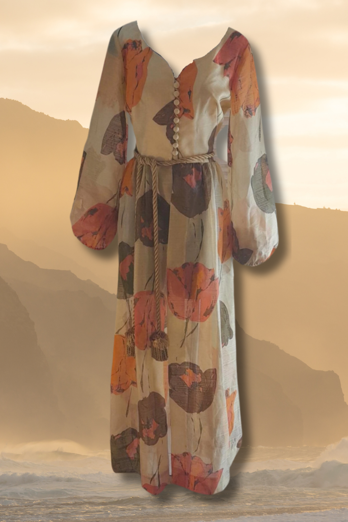 Admire this stunning hostess dress by Alfred Shaheen, featuring a bold sheer design that can be styled with slacks, a skirt, or shorts. It boasts dreamy peasant sleeves with elastic cuffs, a fabulous gold-rope belt with tassels, and an elegant sheer A-line bottom with fabric-covered buttons. It's a true statement piece.