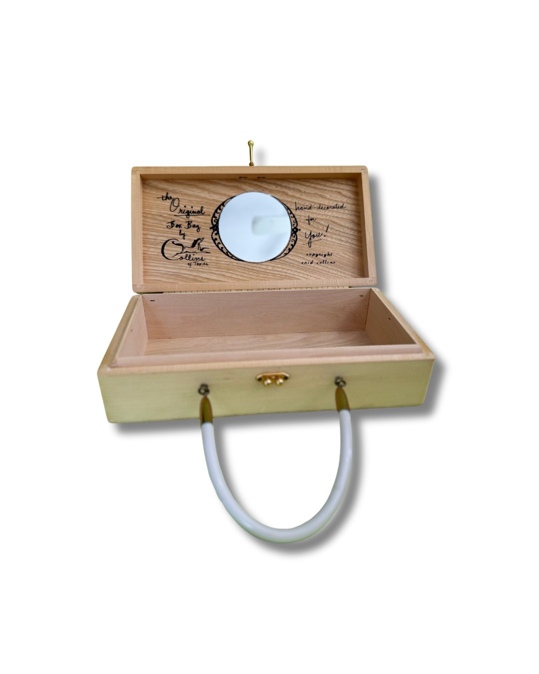 This handbag is more than just an accessory—it's a wearable piece of art. The playful yet sophisticated "Money Tree" design, complete with gold coin details, lush green foliage, and delicate floral accents, captures the charm and optimism of the 1960s era. The wooden box construction lends a timeless, structured appeal, making it as practical as it is beautiful.