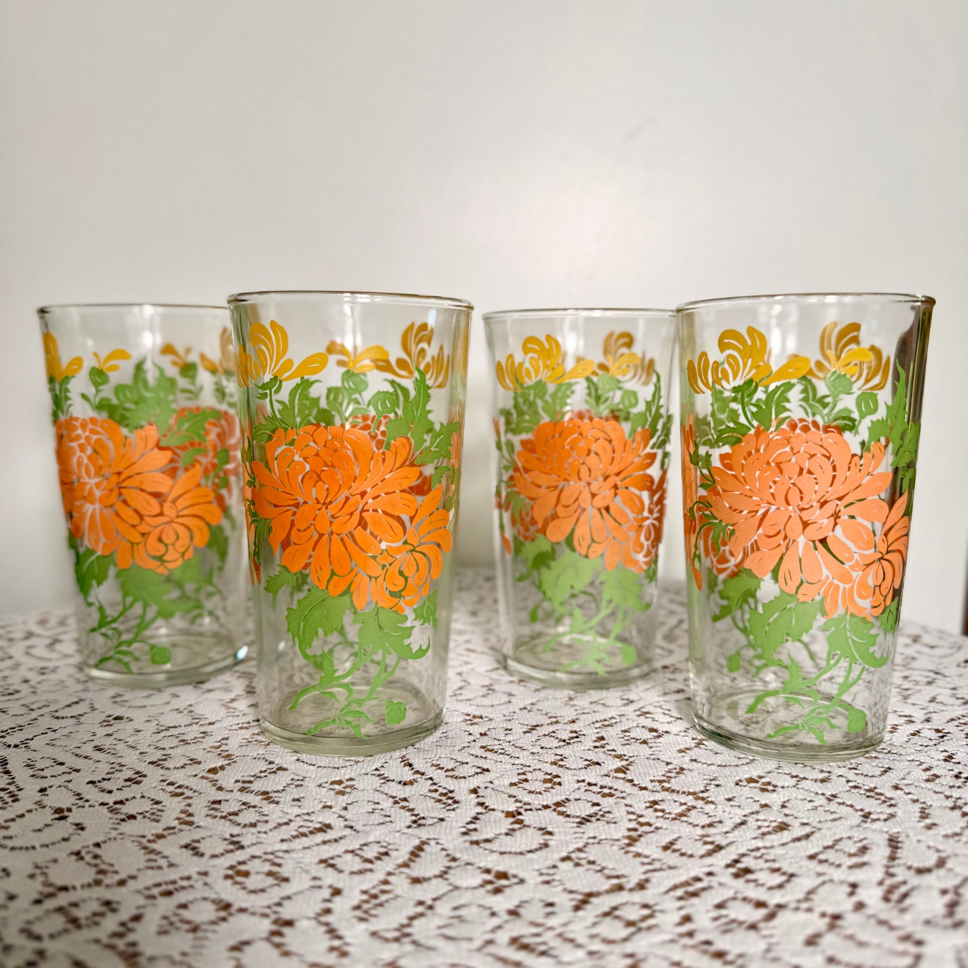 5″ tall clear glass tumblers showcasing bold orange chrysanthemum blooms and green leaves—colorful retro drinkware perfect for Sunny Hour vibes.