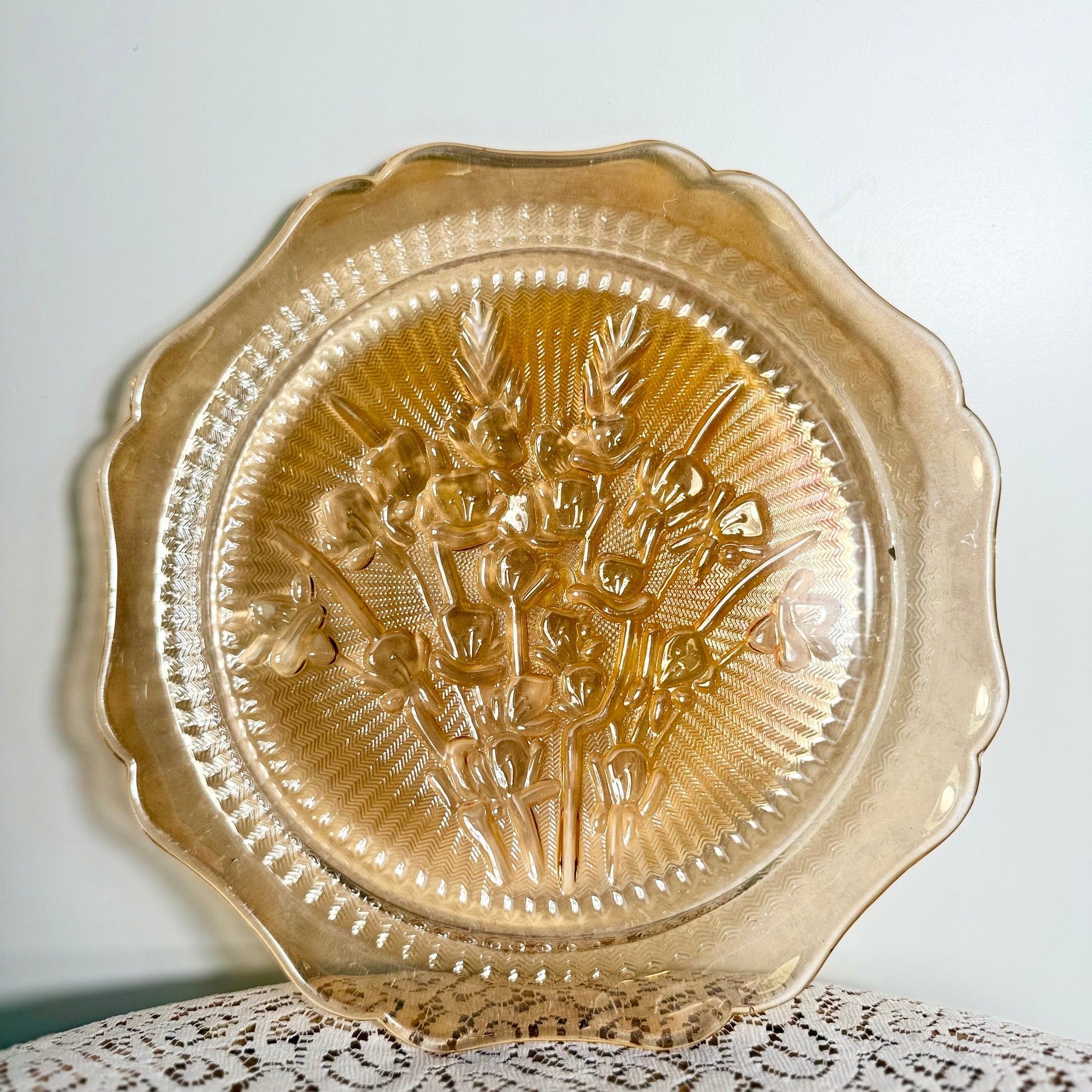 A 9″ scalloped platter featuring etched iris blossoms over a textured herringbone ground, shining in warm marigold tones. -
